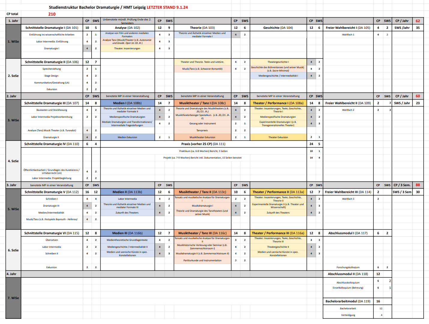 BACHELOR: Im Bachelorstudiengang verschaffen sich die Studierenden in den ersten beiden Semestern einen Überblick über Theorie und Geschichte von Theater, Medien und Musik/ Tanz und üben ihre Analysefertigkeiten. Sie erproben, welchem der drei Bereiche ihr besonderes Interesse gilt. Ab dem dritten Semester können und müssen sie sich für einen dieser drei Schwerpunkte entscheiden. Parallel zu dieser Schwerpunktbildung haben sie bis ins sechste Semester weiterhin gemeinsame Lehrveranstaltungen zu berufsbildenden Fertigkeiten und zu übergreifenden Fragestellungen. Im vierten Semester widmen sich die Studierenden der Praxis, indem sie an selbstgewählten Institutionen hospitieren und ein eigenes Projekt entwickeln. Das siebte Semester ist dem Verfassen der Bachelorarbeit vorbehalten.
